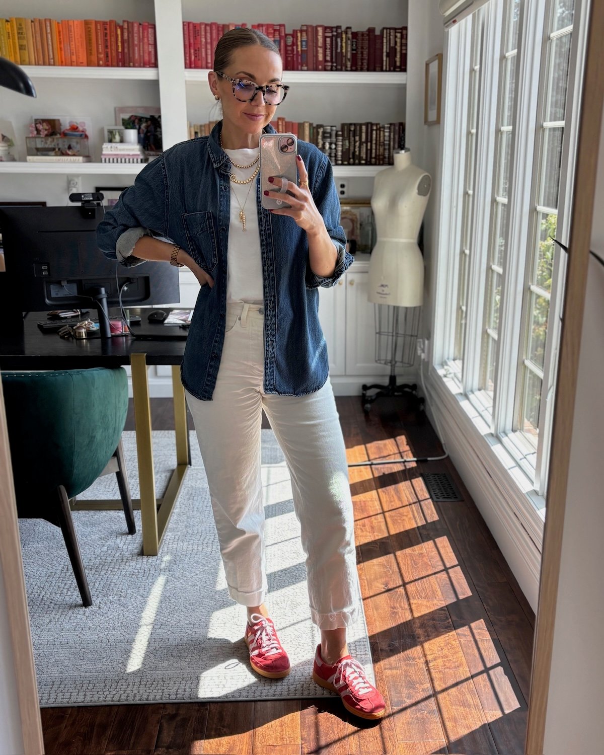 OUTFIT 2: ADIDAS | SIMILAR WHITE JEANS | TARGET T-SHIRT | SIMILAR OVERSIZED DENIM SHIRT | NECKLACES | BLUE-LIGHT GLASSES
