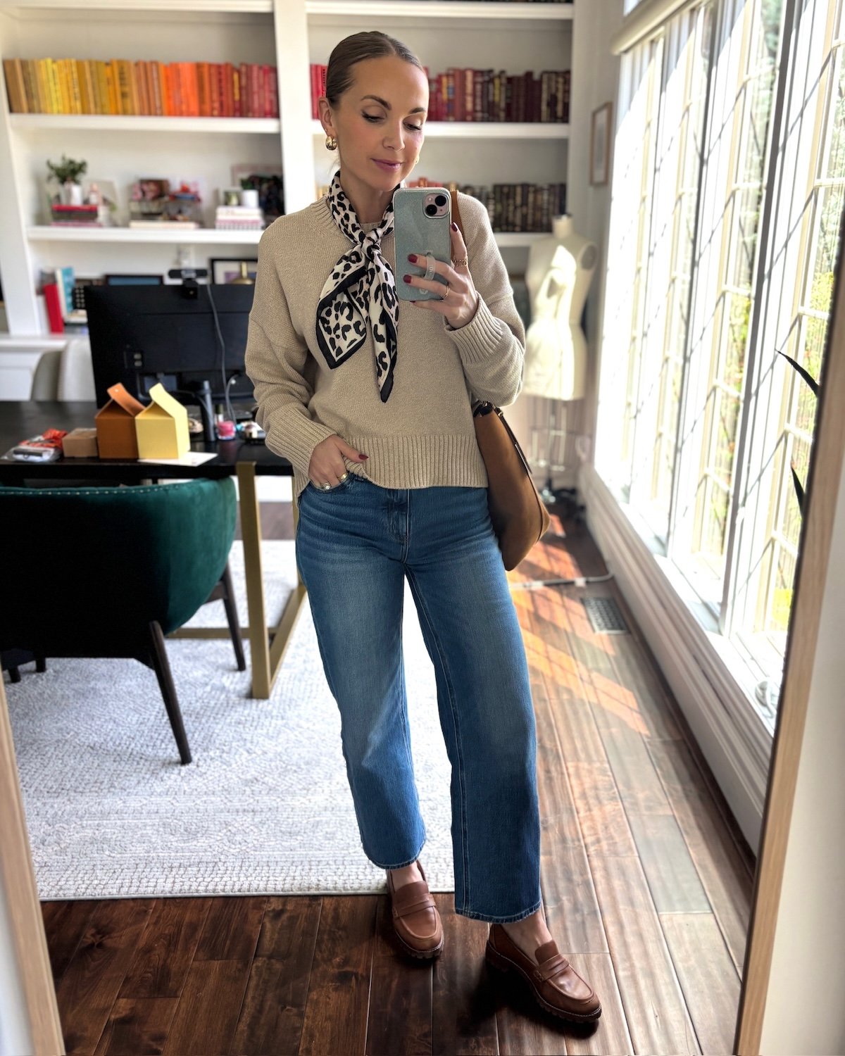OUTFIT 1: SIMILAR LOAFERS | QUINCE JEANS | QUINCE SWEATER | ANTHRO SCARF | LARGE BAG