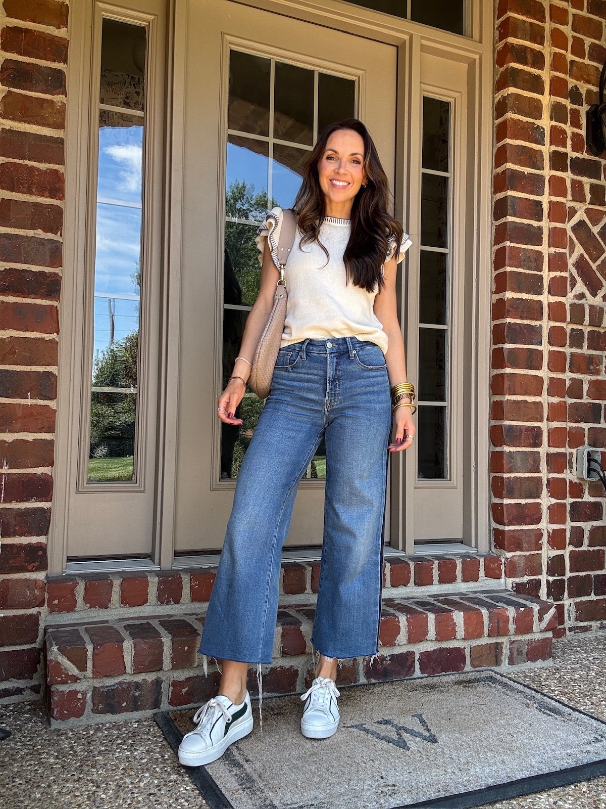 OUTFIT 2: SIMILAR SNEAKERS | KUT FROM THE KLOTH TRACK JEANS | NORDSTROM TOP (SOLD-OUT, OTHER COLORHERE) | QUINCE BAG