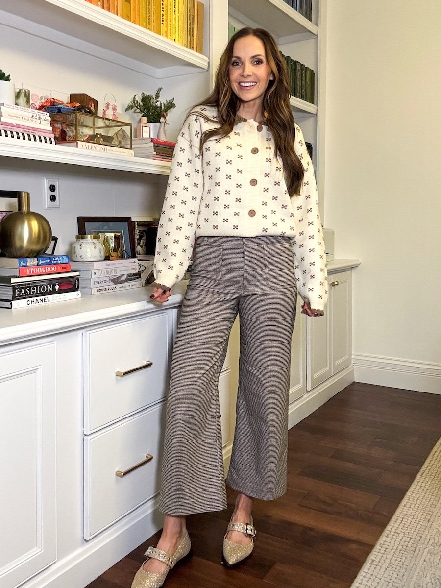 TOBIE DRESS / SOMERSET DRESS / PATTERNED CARDIGAN / HOUNDSTOOTH PANTS
