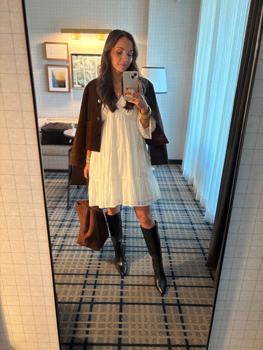 SIMILAR BLACK BOOTS | NORDSTROM DRESS| MADEWELL JACKET | MADEWELL BAG